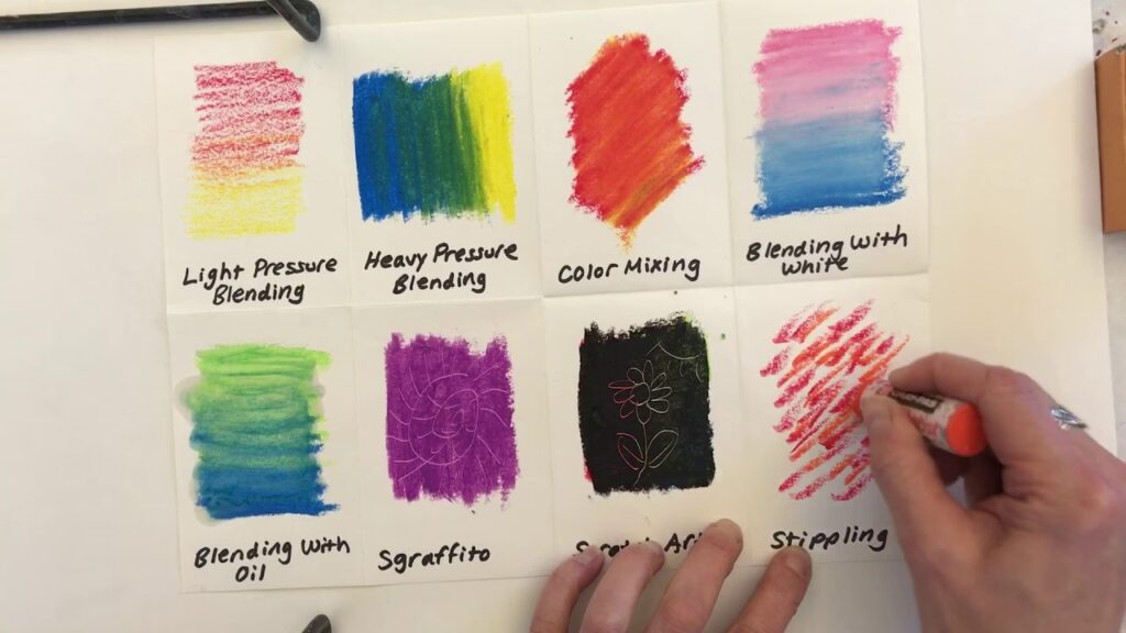 Aplica pequeños puntos de pastel de varios colores muy juntos. Cuando se observa desde la distancia, los puntos se mezclan ópticamente para formar nuevos colores y texturas complejas. Esta técnica, popularizada por los postimpresionistas, puede crear efectos vibrantes y luminosos.