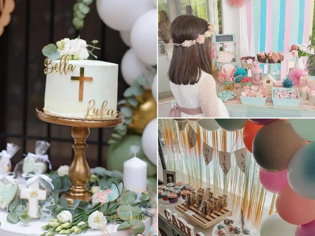 Los tonos suaves y femeninos siguen siendo una apuesta segura y encantadora. Piensa en colores pastel como el rosa cuarzo, el coral, el lila o el amarillo pálido. La combinación de blanco y dorado aporta un toque de sofisticación y luz. Sin embargo, no hay que limitarse. Un estilo vintage con jaulas blancas, flores secas y toques de encaje puede ser maravilloso. O, para una opción más lúdica, los globos en tonos metalizados y los botes de cristal repletos de chucherías de colores son un éxito garantizado entre los más pequeños.