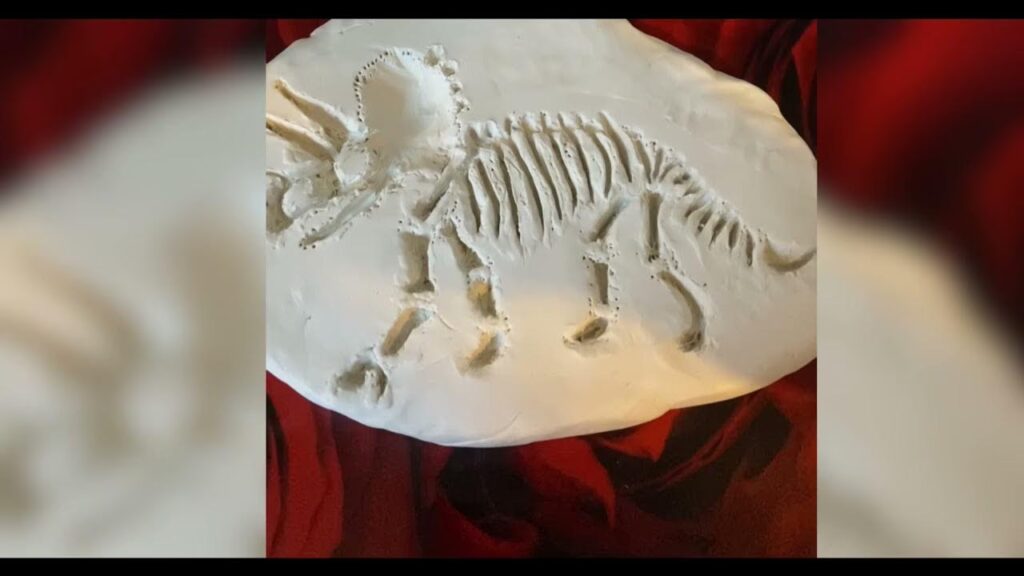 - Ahora, crea la impresión. Presiona suavemente un objeto más grande, como un esqueleto de dinosaurio de juguete (limpio), sobre una sección de la "tierra".