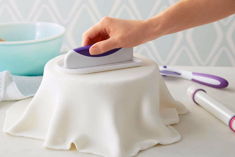 5. Perfeccionamiento: Una vez que todo el fondant esté adherido, pasa el alisador por los laterales para obtener un acabado pulcro y profesional.