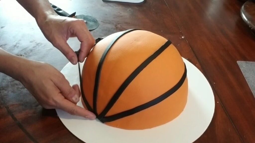 Para la pelota, tiñe fondant de color naranja intenso. Cubre la media esfera, que previamente habrás colocado sobre una base de cartón fina con un agujero en el centro. Alisa la superficie con las manos o un alisador de fondant para un acabado pulcro. Con mucho cuidado, coloca la media esfera sobre la tarta base, haciendo pasar el tubo de soporte central por el agujero que hiciste. Ahora, corta finas tiras de fondant negro y pégalas sobre la esfera naranja con un poco de agua o pegamento comestible, imitando las líneas características de una pelota de baloncesto. ¡La decoración está casi lista!
