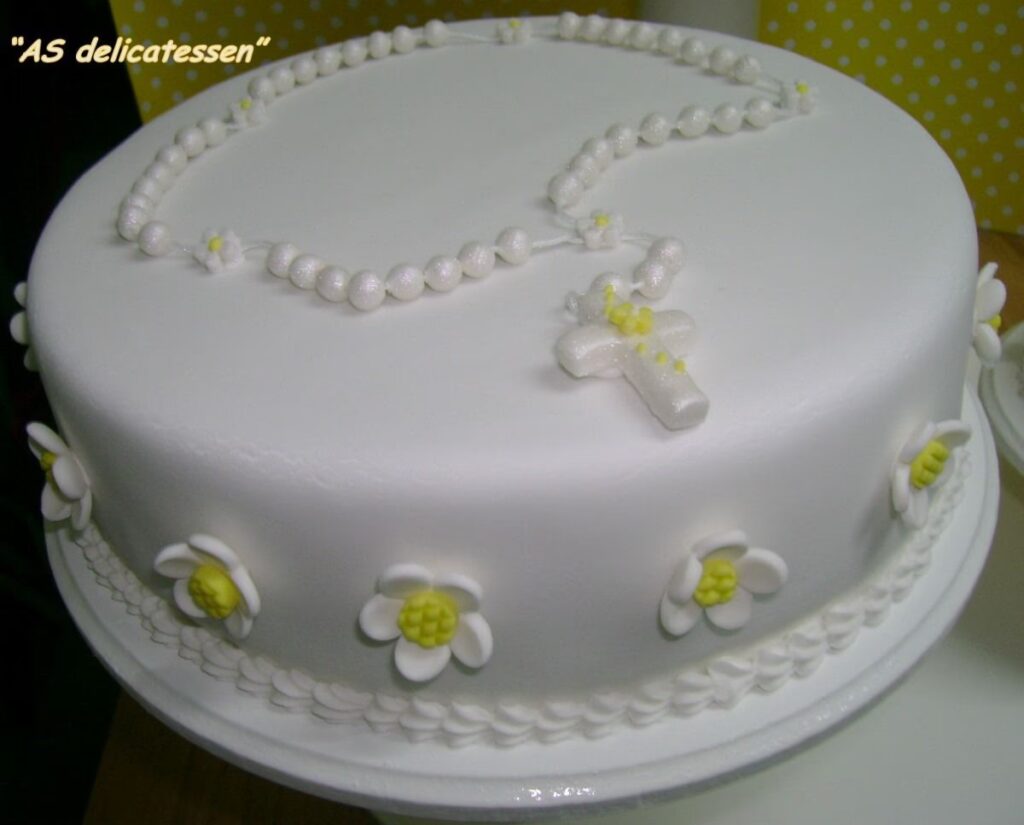 - Estilo Clásico y Puro: El blanco sigue siendo el rey, simbolizando la pureza del acto. Se puede enriquecer con texturas sutiles en el fondant, perlas de azúcar, delicadas flores de pasta de azúcar (como lirios o paniculata) o un elegante acolchado. Un topper con un cáliz, una cruz o una paloma en tonos dorados o plateados aporta el toque final de distinción.