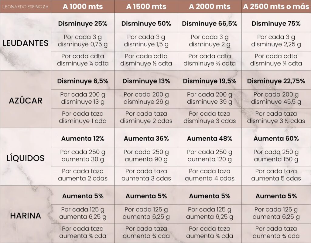 Altitud (metros)Temperatura del HornoPolvo de Hornear (por cada cdta.)Azúcar (por cada taza)Líquido (por cada taza)