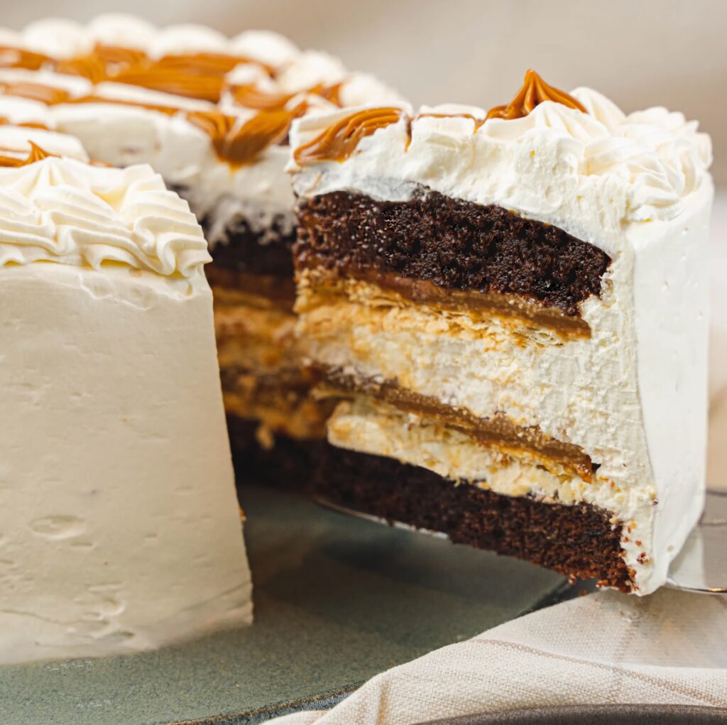 El manjar, también conocido como dulce de leche, es el corazón cremoso y acaramelado de la torta. Su dulzura inconfundible y su textura sedosa unifican todos los sabores. Junto a él, discos o trozos de merengue seco aportan otro nivel de crocancia y una dulzura etérea que se disuelve en la boca, complementando a la perfección la densidad del manjar.