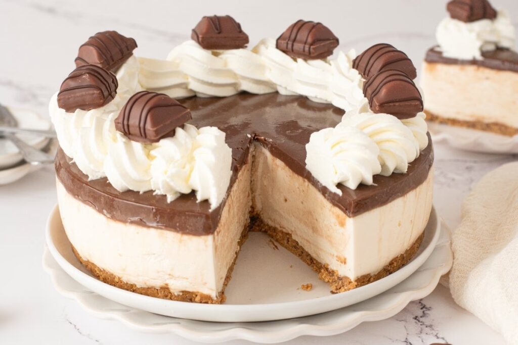 - Decorar y servir: Una vez la tarta esté firme, desmóldala con cuidado. Derrite el chocolate negro en el microondas o al baño maría. Con una cuchara, crea hilos de chocolate sobre la superficie de la tarta. Finaliza la decoración colocando trozos de las barritas de Kinder Bueno que reservaste. ¡Ya está lista para disfrutar!