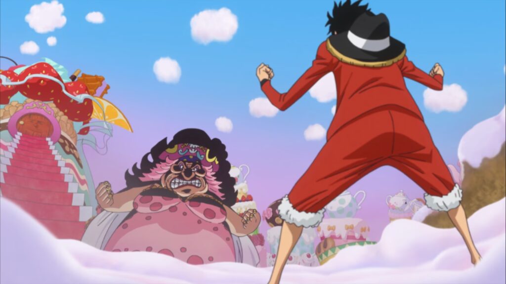 Sin embargo, bajo sus capas de bizcocho y crema se esconde un plan siniestro. La boda es una farsa diseñada para asesinar a la familia de Sanji. Cuando Luffy y sus aliados irrumpen en la ceremonia, lo hacen estallando desde dentro del propio pastel, en un acto simbólico que destruye no solo el postre, sino la falsa celebración y la alianza misma. La imagen del pastel desmoronándose es devastadora para Big Mom, no por su valor culinario, sino por lo que representa: el colapso de sus planes perfectamente calculados.