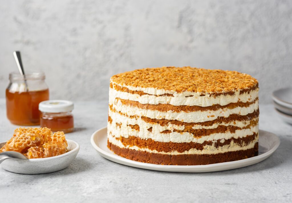 Aunque la receta romana exacta se ha perdido en el tiempo, podemos conectar con su espíritu a través de una de las tartas de miel más espectaculares del mundo: la tarta de miel rusa o Medovik. Esta tarta, compuesta por múltiples capas de galleta de miel y una crema suave, es una delicia que evoca la calidez y la riqueza del postre original.