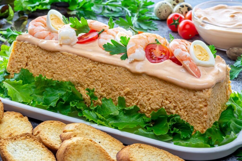 Una vez que tu pastel esté bien cuajado, desmóldalo con cuidado sobre una fuente de servir. La decoración es el toque final. Puedes cubrirlo con una capa fina de mayonesa o salsa rosa y adornarlo con langostinos cocidos, rodajas de tomate cherry, aceitunas y unas hojas de eneldo. Sírvelo acompañado de más salsa en un bol aparte y una selección de panes tostados o picos de pan. Este pastel no solo es una delicia al paladar, sino también un espectáculo visual que te hará quedar como un auténtico chef.