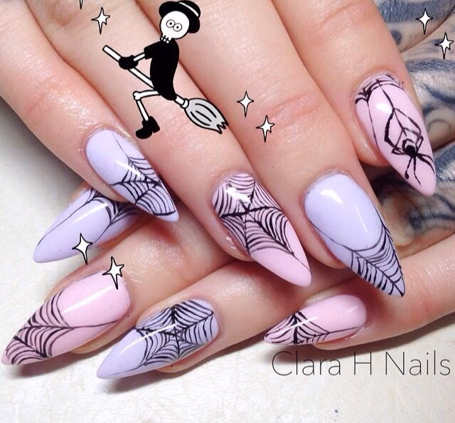 Esta tendencia fusiona la oscuridad gótica con la dulzura de los colores pastel. Imagina una base de color lavanda, rosa bebé o menta, sobre la cual se dibujan con trazo negro finas telarañas, calaveras sonrientes o pequeños huesos. Es un contraste encantador que juega con lo "cute" y lo "creepy". Para lograr este look, se suelen usar contornos oscuros para definir los diseños pastel, y se pueden añadir toques de glitter o pedrería para un extra de fantasía.