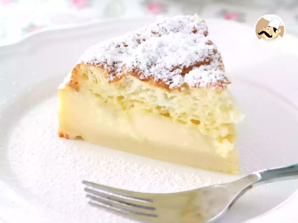 El Pastel Mágico, de origen rumano, debe su nombre a la asombrosa transformación que sufre en el horno. A simple vista, preparas una masa bastante líquida, casi como la de unos crepes. Sin embargo, gracias a la ciencia de la cocina y a una cocción lenta a baja temperatura, los ingredientes se separan por densidad. Las claras de huevo batidas, al ser más ligeras, suben a la superficie para formar una capa de bizcocho aireado. Las yemas y la harina se asientan en el medio, cuajando en una textura de flan o crema pastelera. Finalmente, la mantequilla y parte de la leche se van al fondo, creando una base más densa y húmeda, parecida a un pudin. Por esta capacidad de "organizarse" solo en el horno, también se le conoce como pastel "inteligente".