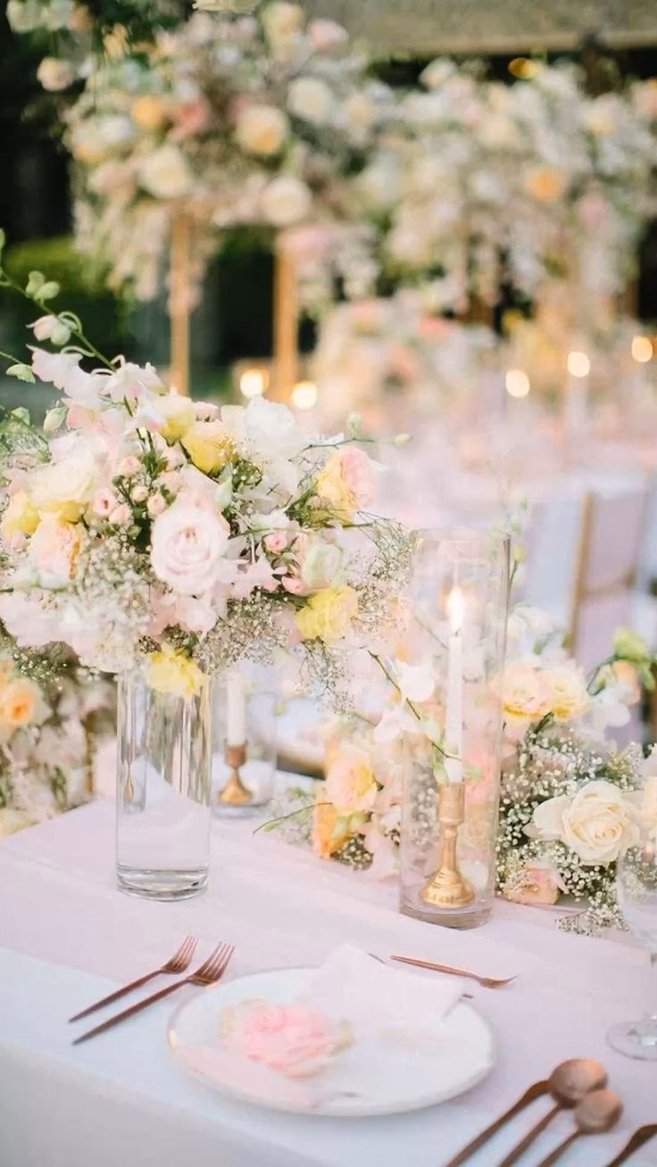 La mantelería es una forma sencilla de establecer la base de color. Un mantel blanco o de color crema permite que los detalles resalten. Utiliza caminos de mesa en rosa o amarillo, o servilletas de tela en estos tonos. La vajilla puede incluir platos con un filo dorado y cristalería con un sutil tinte rosado. Las velas altas en candelabros dorados, alternando colores rosa y amarillo, crearán una atmósfera íntima y cálida cuando caiga la noche.