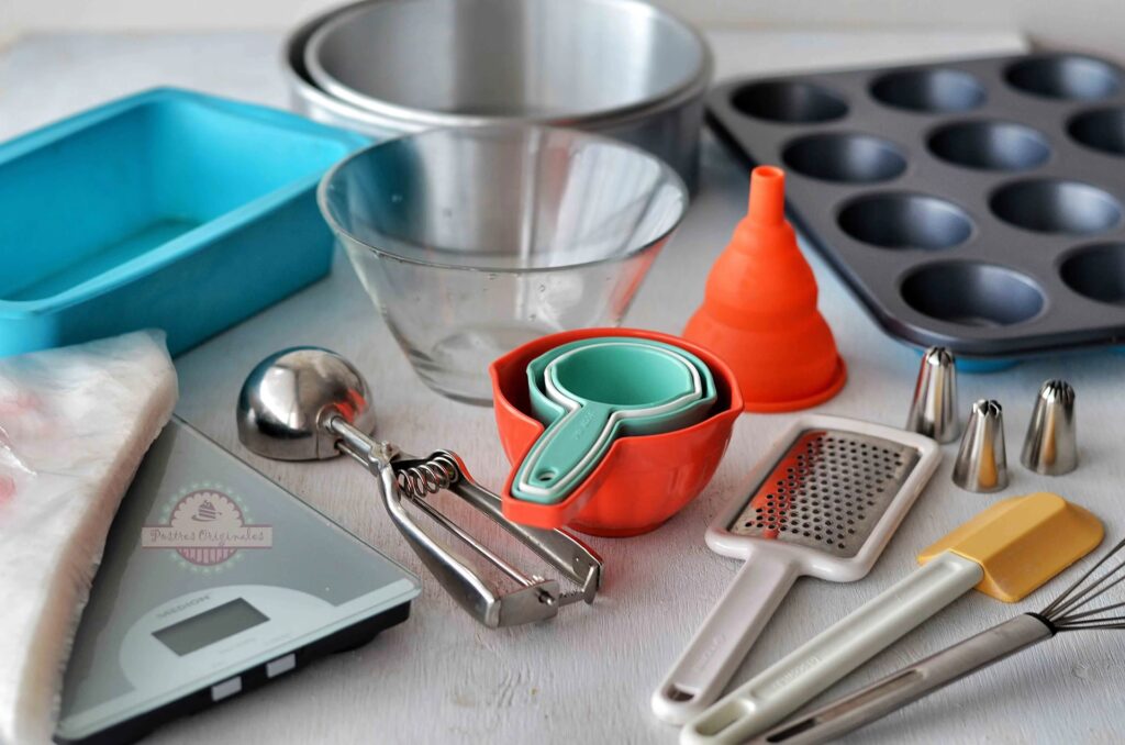 - Herramientas y utillaje: Aquí la lista es casi infinita y es el día a día del pastelero. Incluye rodillos, juegos de boquillas y mangas pasteleras, cortapastas, moldes de todo tipo (silicona, aros, plum-cake), espátulas, varillas, balanzas de precisión, termómetros, pesajarabes y mucho más.
