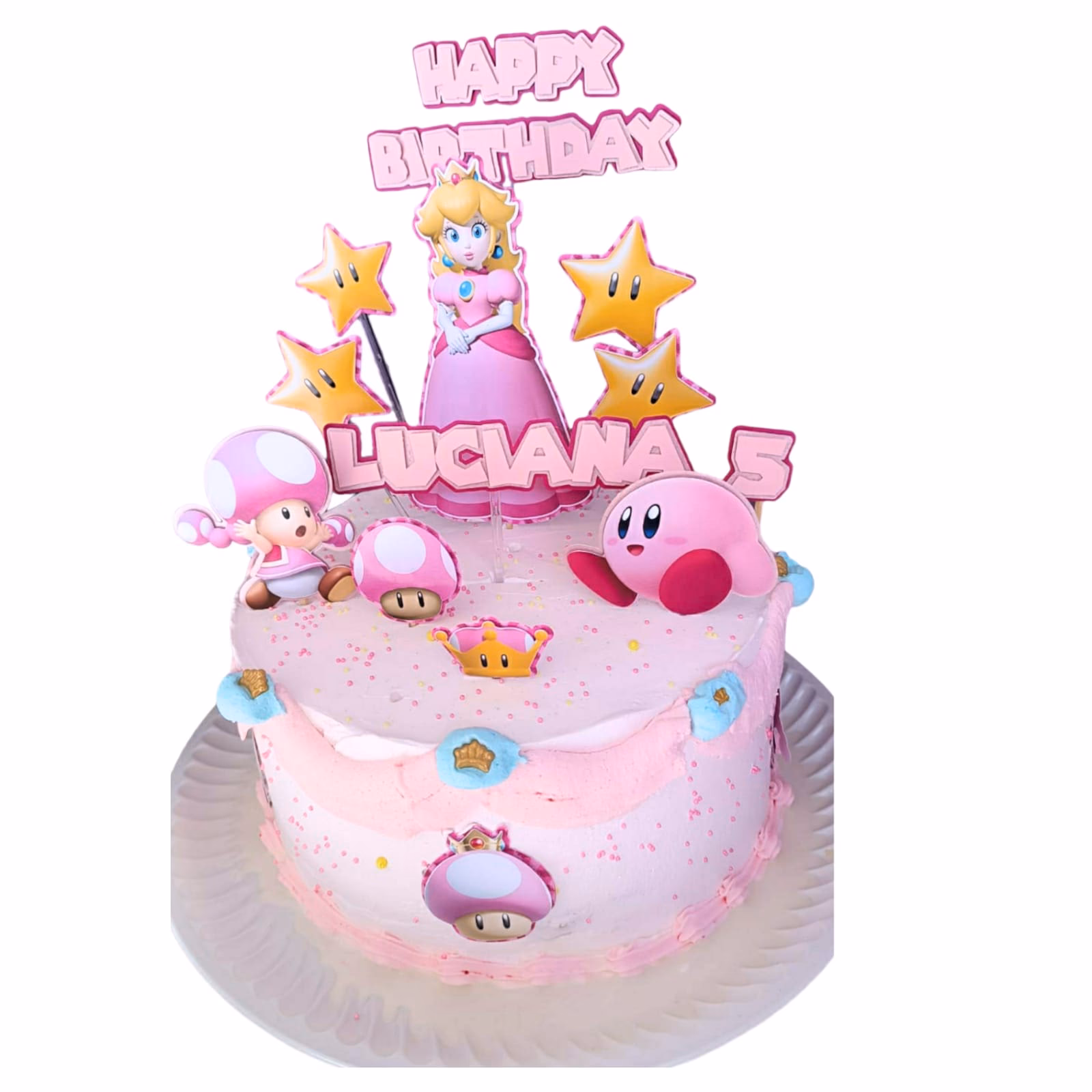 - Pastel con Imagen Comestible: Una opción práctica y accesible. Un pastel de una o dos capas, con una lámina de papel de azúcar impresa con la imagen de las princesas favoritas de tu hija. Se puede complementar con decoraciones en crema en los bordes para darle un toque más festivo.