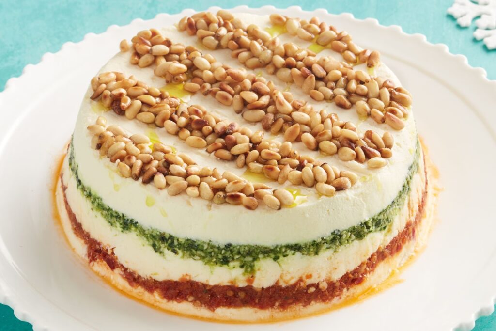 - Capa por capa: Comienza a construir tu torta. Presiona firmemente la mezcla de queso crema y tomates secos en el fondo del molde, creando una capa uniforme. Continúa con una capa del queso crema natural, alisando la superficie con una espátula. Finalmente, añade la capa de queso crema con pesto. Puedes alternar las capas como prefieras para crear un diseño único.