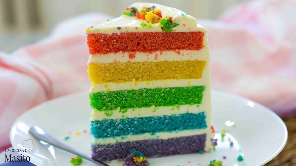 • Montaje: Una vez que todos los bizcochos de colores se han enfriado por completo, se procede al montaje. Se apilan uno sobre otro, uniendo cada capa con una fina película de crema o frosting. Tradicionalmente, se sigue el orden de los colores del arcoíris para un efecto más espectacular.
