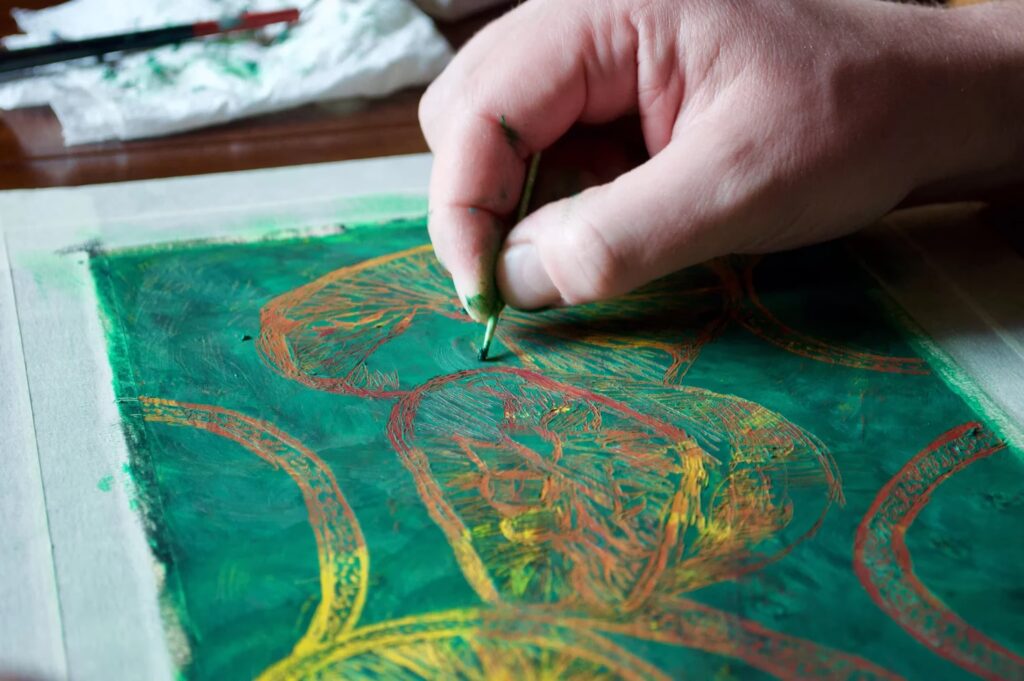 Con tu pastel listo, es hora de dibujar. Puedes tener un boceto de tu diseño Hamsa en papel para guiarte. Con tu punzón o palillo, comienza a rascar suavemente la capa superior. Verás cómo los colores vibrantes de la base comienzan a revelarse con cada trazo. Limpia la punta de tu herramienta con frecuencia para mantener las líneas nítidas y evitar que se arrastre el color. Dibuja el contorno de la mano, el ojo central, los patrones geométricos y todos los detalles que desees. Juega con el grosor de las líneas para añadir dimensión.