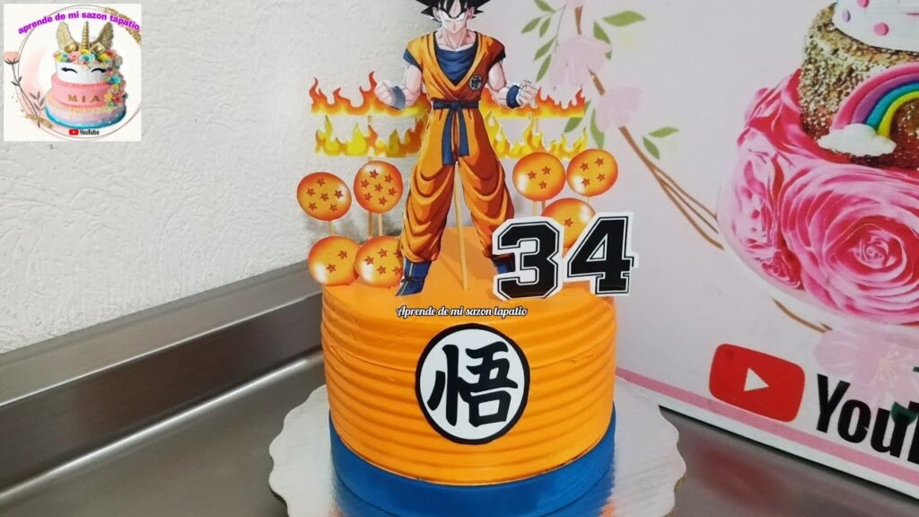 - Goku Super Saiyajin: El diseño más popular suele ser una figura de Goku en plena transformación. El pastel puede ser una base simple, pero el topper o la figura de Goku debe ser el centro de atención, con su cabello dorado y su aura de poder, que se puede simular con picos de merengue italiano amarillo o llamas de isomalta.