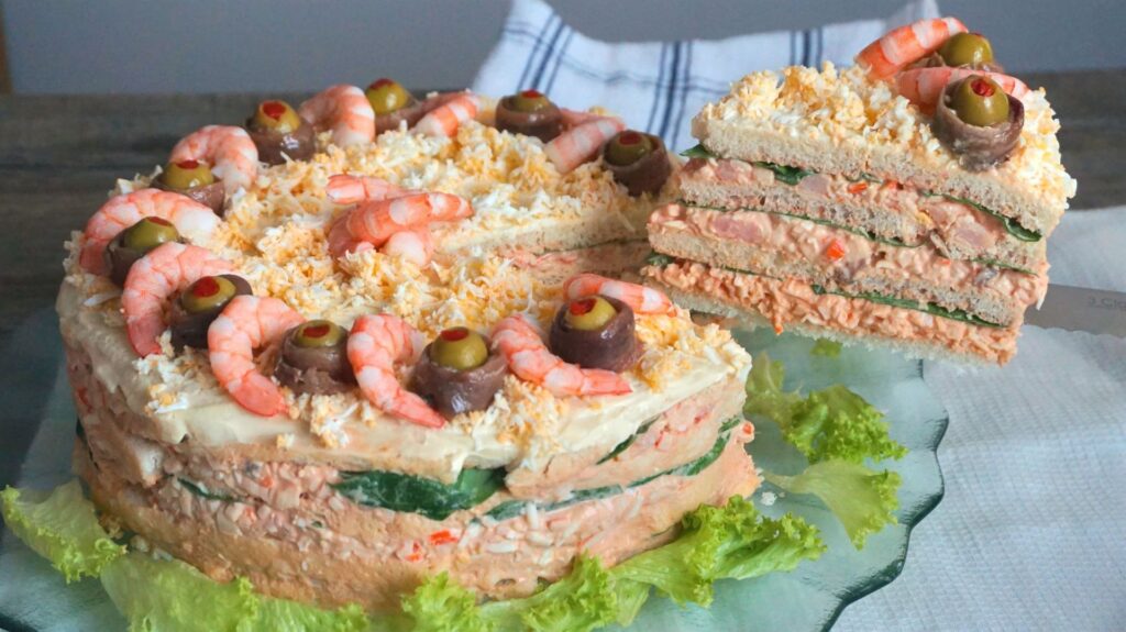 La presentación es clave. Cubre el pastel con una fina capa de salsa rosa o mayonesa. Decora la superficie con unos langostinos cocidos enteros, unas hojas de perejil fresco, o incluso un poco de huevo duro rallado en los laterales. Para un toque de lujo supremo, unas huevas de salmón o un poco de caviar en la parte superior lo elevarán a otro nivel.